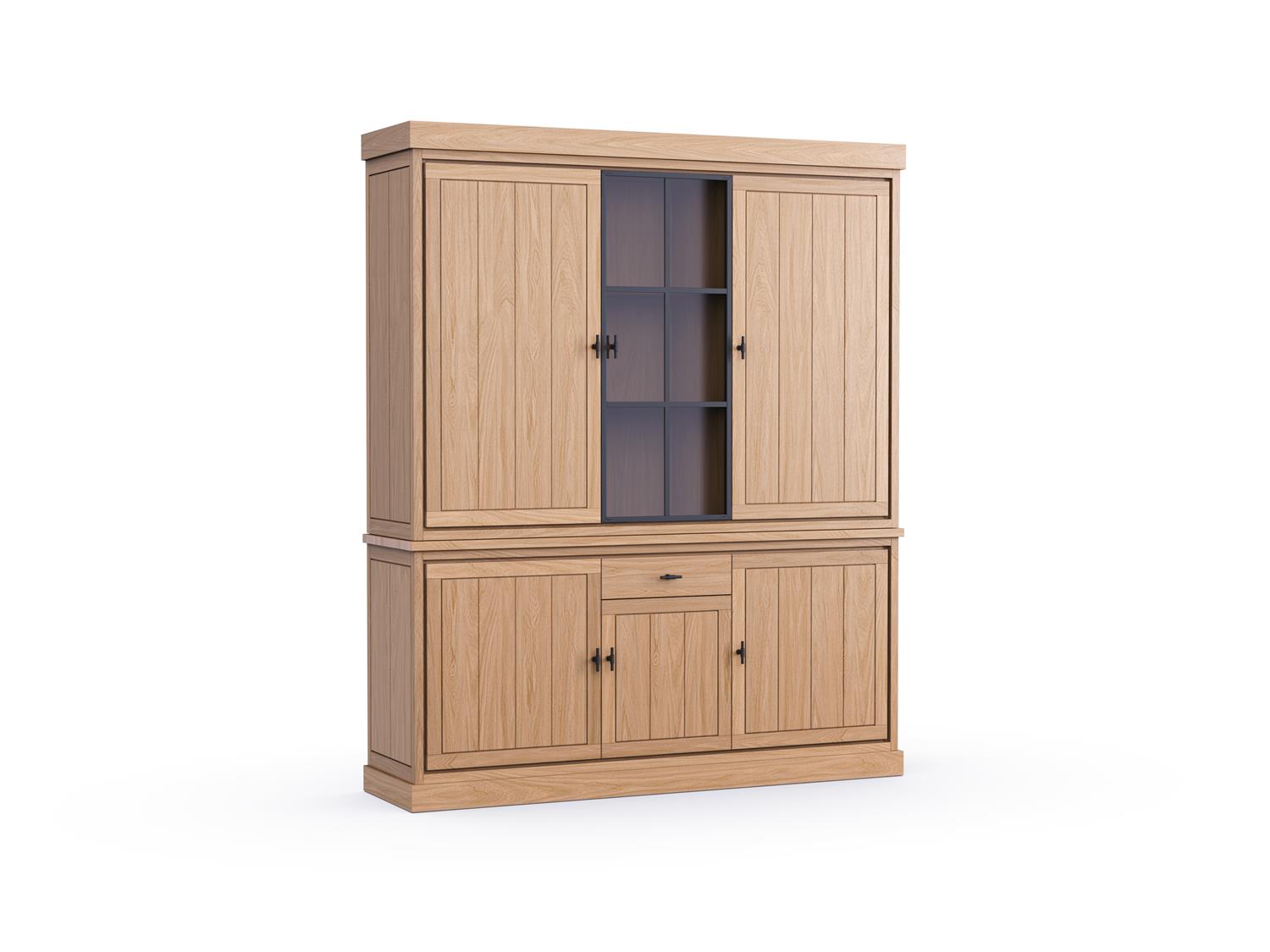 Met 5 massieve deuren, één glasdeur en één schuif biedt de buffetkast een overvloed aan opbergruimte én een plek om je mooiste servies of decoratie in de kijker te zetten. Zo combineert het praktische gebruiksgemak met een verfijnde uitstraling.